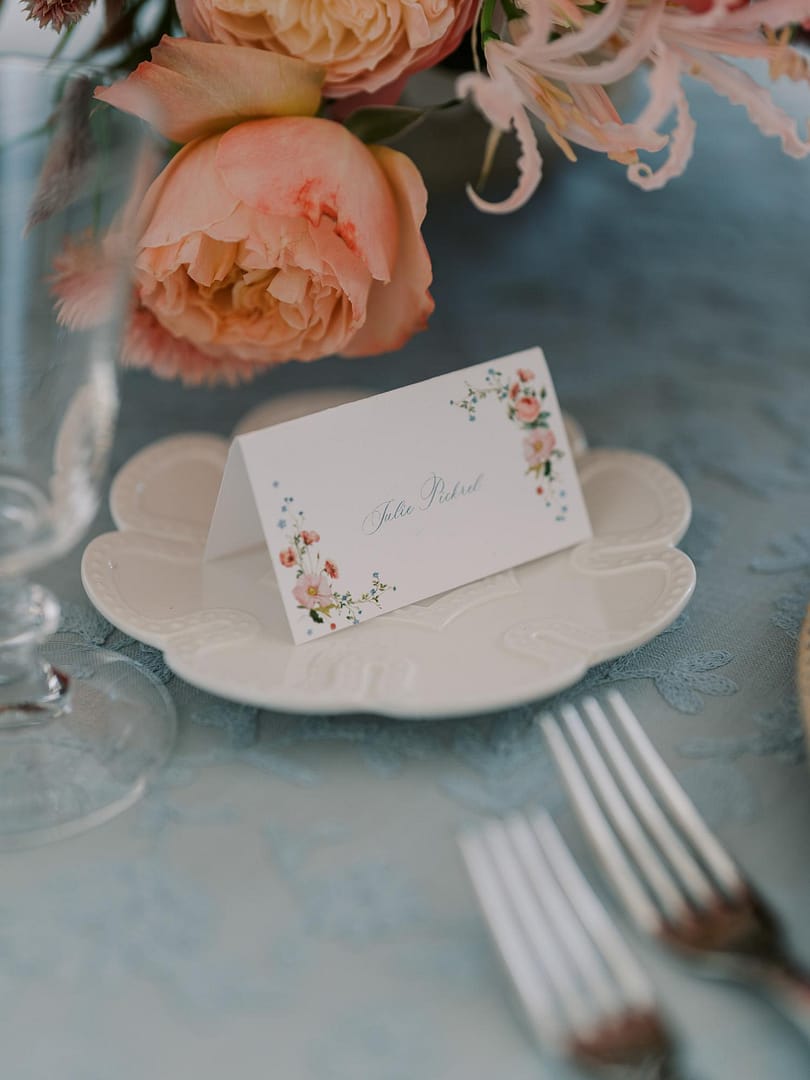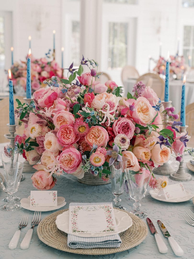 Qui vedrai come stilista Gioia Proctor ha messo in risalto i delicati fiori blu nelle composizioni con morbide tovaglie blu, tovaglioli e dipinti a mano da massaggio profumate per temperare le audaci rose rosa. Ha anche incorporato materiali naturali con candelabri e sedie in legno e sottobicchieri e vasi in rattan imbiancati, per conferire un'atmosfera estiva organica al tavolo. Il tocco finale è con una bella cancelleria di Arabella giugno, che rifletteva le composizioni floreali del tavolo.
