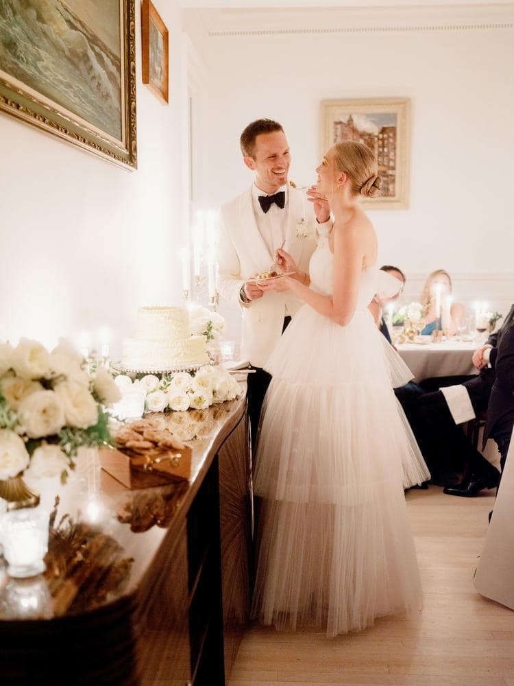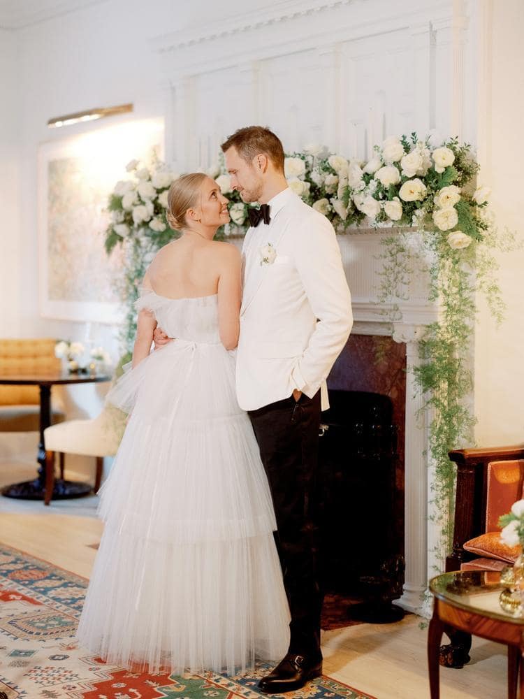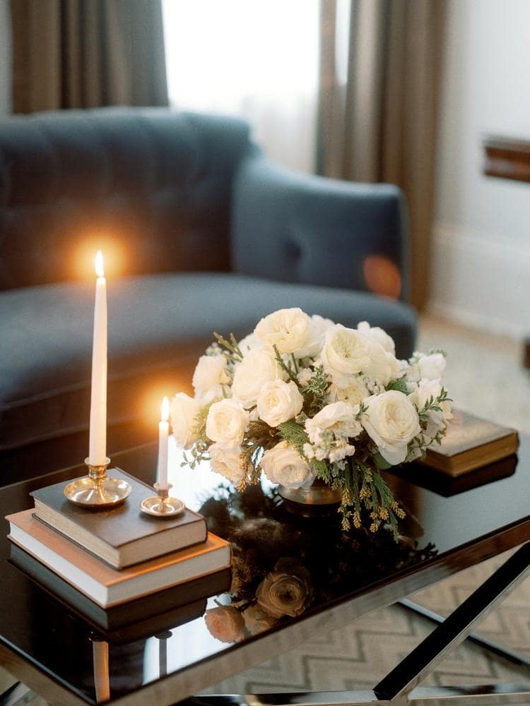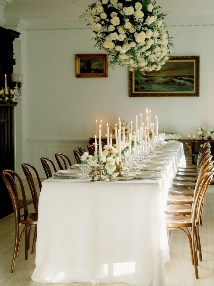 If you are dreaming of a classically elegant wedding, filled with roses and the glow of candlelight, this intimate winter wedding delivers on every level. Sophisticated elegance flows throughout, from the vintage Dior gown and understated hairstyle to the carefully curated and intimate guest list. The single-colour palette added a true sense of luxury, from the spectacular over-table floral installation to the rose-adorned staircase, creating a magical moment for the first look. Every detail is carefully considered, evoking a serene yet opulent winter atmosphere.