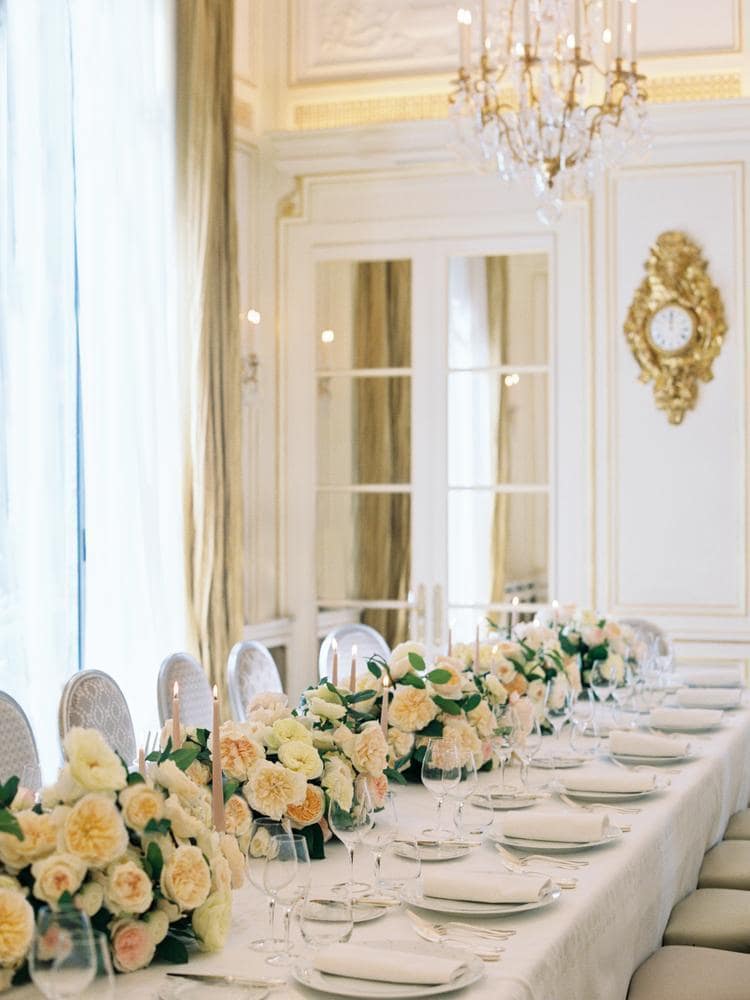 This luxury city wedding exudes classic Parisian elegance, with a chic and understated palette of ivory, white and blush. The all-rose bouquet is stunning in its simplicity, pairing perfectly with fashion and accessories that offer a subtle nod to the city’s renowned style. Sophisticated elegance continues throughout the wedding reception. Le Salon Organza, overlooking a picturesque courtyard and the hotel’s iconic red canopies, provides a striking backdrop, while the roses contrast beautifully with the gilded and glamorous interior. Inspirational, serene and decadently designed, this ivory wedding embodies timeless sophistication and effortless style.